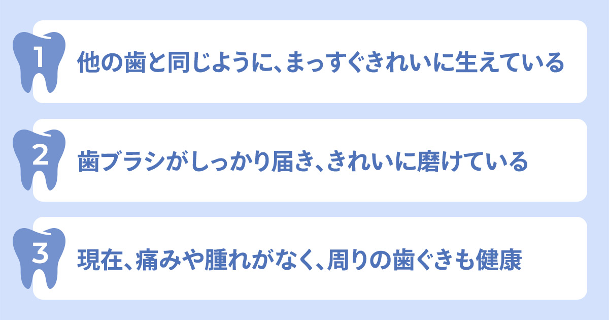 では、どのような親知らずであれば、抜かずに済むのでしょうか。 一言でいえば、「他の歯と同じように、正しく機能していて、トラブルを起こすリスクが低い親知らず」です。 具体的には、以下の3つの条件をすべて満たしていることが一つの目安となります。